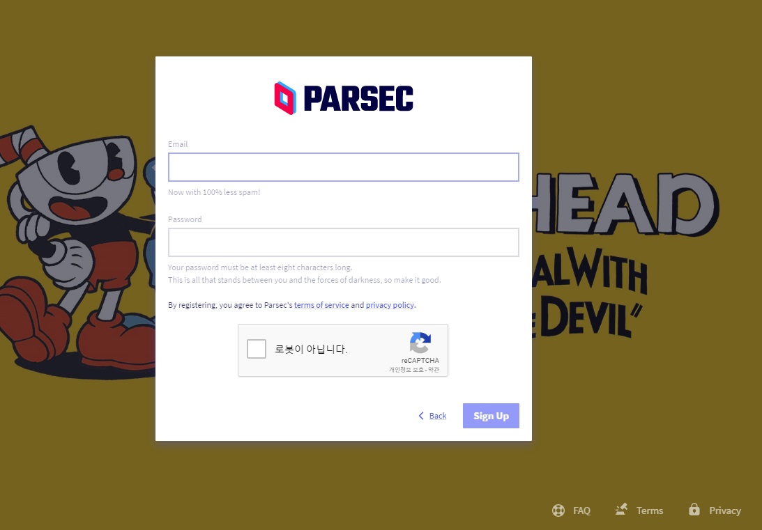 ▲ 이메일 주소와 비밀번호를 입력한 후 "Sign Up"을 클릭하여 Parsec 가입을 완료합니다.