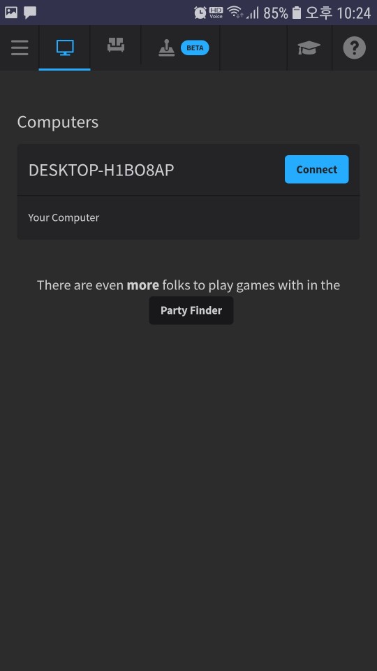 ▲ 로그인이 완료되면 Computers에 연결된 PC가 위에 화면처럼 나타납니다. 옆에 Connect를 눌러주면 PC와 연결이 됩니다. 바로 PC 스트리밍을 시작할 수 있습니다.