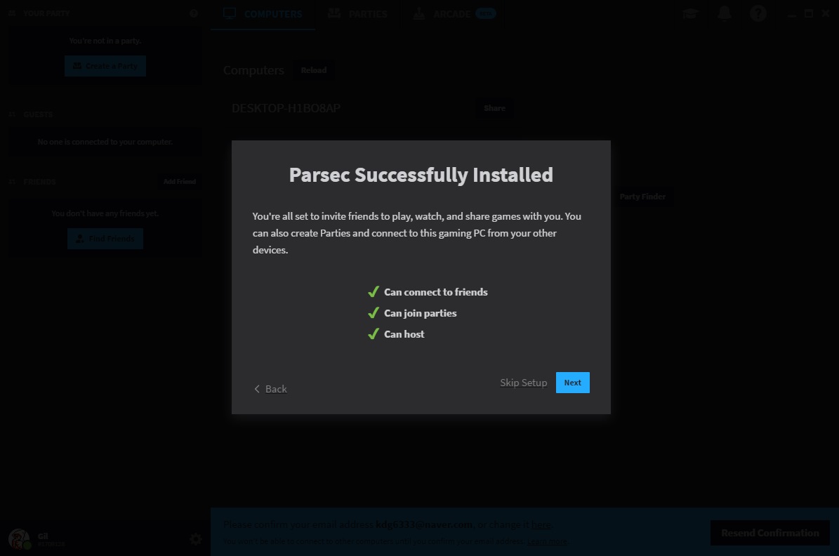 ▲ Parsec 계정 생성 후 로그인까지 완료하면 위와 같은 화면이 뜨는데요. 정상적으로 설치가 완료되었다는 설명입니다.